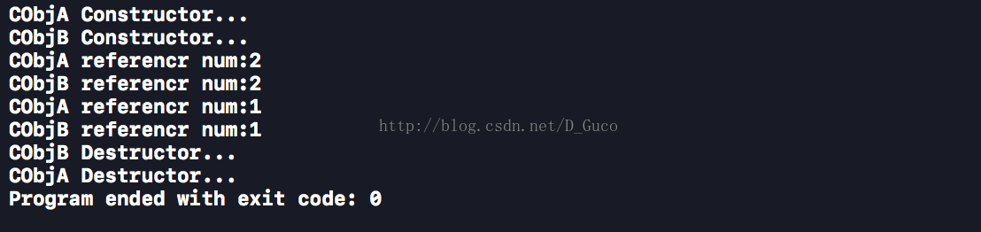如何证明这个结论呢,我们手动释放掉两个对象对对方的引用,就可以解除循环引用关系,正确析构对象了(把注释部分代码打开)。运行结果: