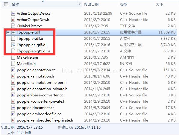 下图为项目目录中的poppler文件夹(已经删去所有.cc文件),因为只用库和头文件,Qt便可隐式调用dll中的函数了。