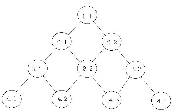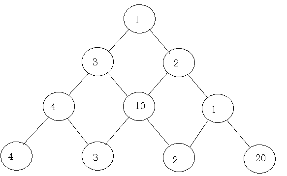题目介绍:如图所示的数字三角形,要求从最上方顶点开始一步一步下到最底层,每一步必须下一层,求出所经过的数字的最大和。