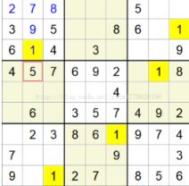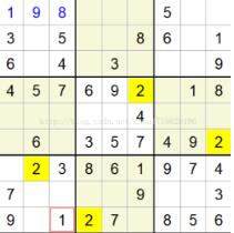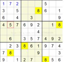 比如这个数独第一个九宫格的候选数就有1,2,7,8,9,我们需要从1开始放入第一个格子挨个尝试直到8的时候发现剩下的两个格子都不能放入