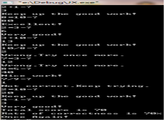 /*a,b随机整数,userAnswer是用户答案,i是控制循环的变量,rightNumber是正确答案数,flag成绩标志,当成绩<75分,其值为1*/