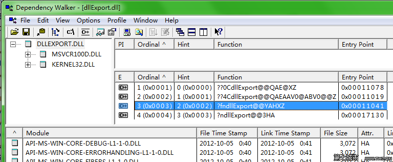 找不到入口点?难道是没导出么?我们用“Dependency Walker”来看看: