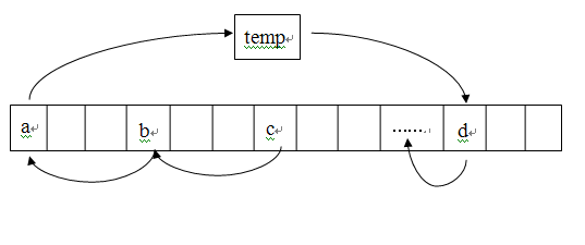 方法一(姑且称之为求模法):借助一个临时变量temp,temp ← V[0],V[0] ← V[i%n],V[i%n] ← V[(2i)%n]…直到(ki)%n =0时,此时所要完成的操作即为V[((k-1)i)%n] ← V[0],而由于变量V[0]的值在被V[i%n]覆盖之前已存入temp,取而代之的操作即为:V[((k-1)i)%n] ← temp。图解表示为(图示的移位个数为i=3):