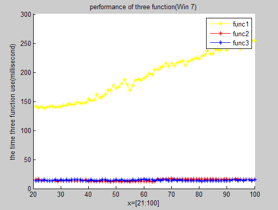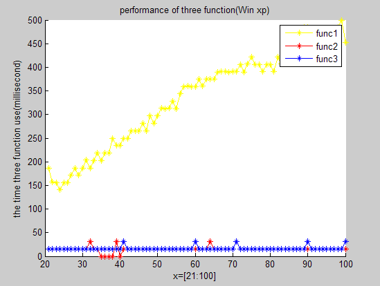 title('performance of three function(Win xp)');