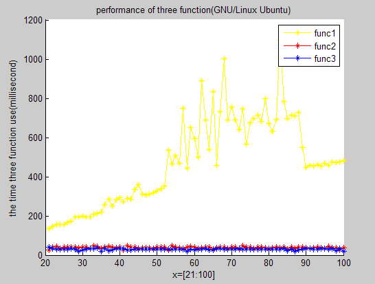 ylabel('the time three function use(millisecond)');