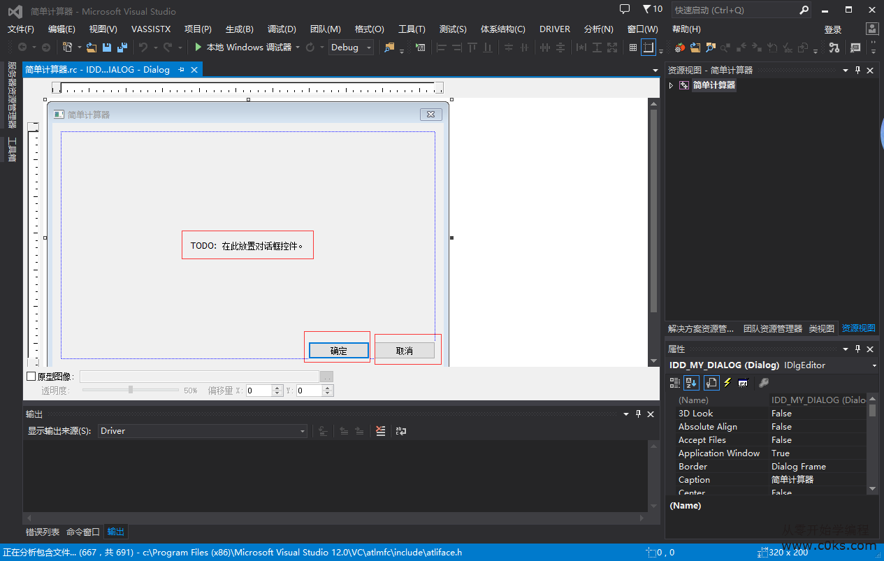 这时候mfc为我们生成了默认的界面,一个静态文本框,两个按钮。
