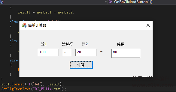 我们就在这个函数里面实现计算,首先获取三个编辑框的内容,判断第二个编辑框的内容(+ - */),然后进行计算,最后把结果显示到第三个编辑框,完成计算器程序。