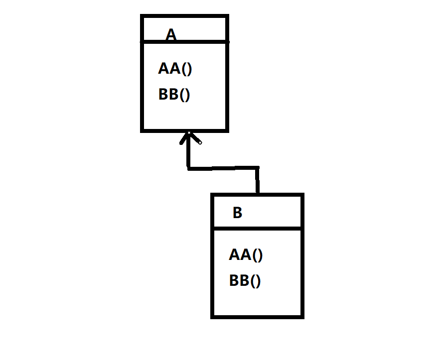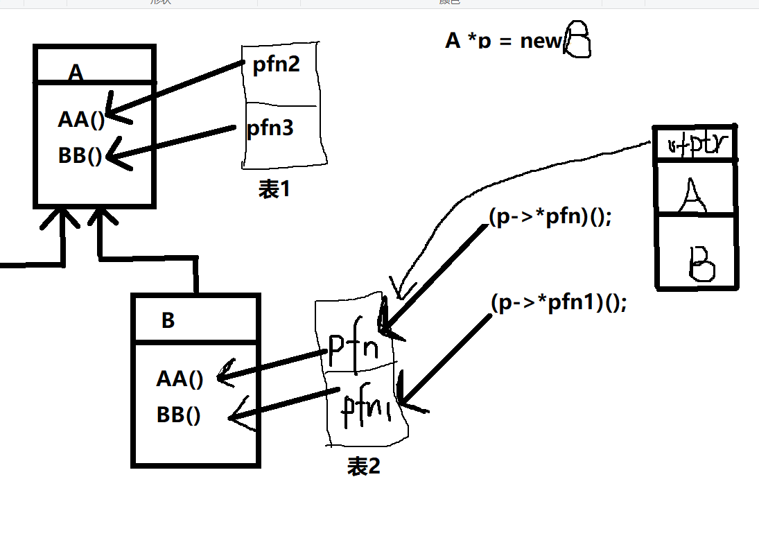此时就是一个单纯的继承的情况,不存在虚函数,然后我new一个对象,A *p = new A;那么 p -> AA(),必然是指向A类中的AA()函数,那么函数的调用有两种方式 一种函数名加()直接调用,一种是利用函数指针进行调用,在这里我想要调用子类的,就可以利用函数指针进行调用,假设出来两个函数指针,来指向B类中的两个成员函数,如果我父类想要调用子类成员,就可以通过 p指针去调用函数指针,再通过函数指针去调用成员函数