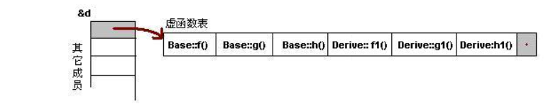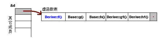 由b所指的内存中的虚函数表的f()的位置已经被Derive::f()函数地址所取代,于是在实际调用发生时,是Derive::f()被调用了。这就实现了多态。