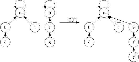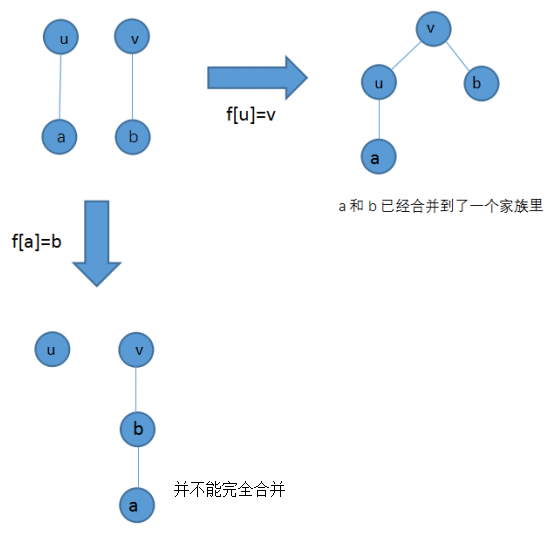 在合并的时候还有一个注意点:为什么不能直接把 a 的父亲指向 b ?因为这样并不能合并完全,a 的父亲, a 的父亲的父亲……,都不能合并到 b 的家族里(想一想,为什么?),如图
