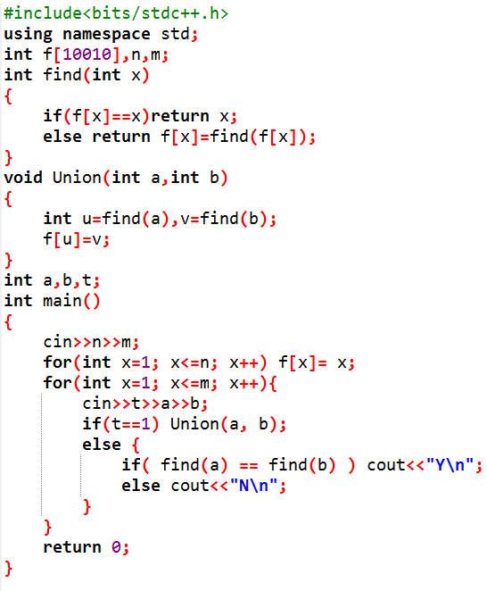 5、查询两个元素是否在同一集合里:查询 a,b 是否在同一集合里,就是看他们的祖先是否相等,若相等则在同一集合里,否则就不在代码如下:if( find(a) == find(b) ) cout<<"Y\n"; //如果祖先相等就输出“Y”else cout<<"N\n"; //否则输出“N”查询两个元素是否在同一集合里:查询 a,b 是否在同一集合里,就是看他们的祖先是否相等,若相等则在同一集合里,否则就不在代码如下:if( find(a) == find(b) ) cout<<"Y\n"; //如果祖先相等就输出“Y”else cout<<"N\n"; //否则输出“N”
