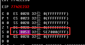 2.1) 打开任意进程,在寄存器窗口找到 fs:[0],查看其内存地址。