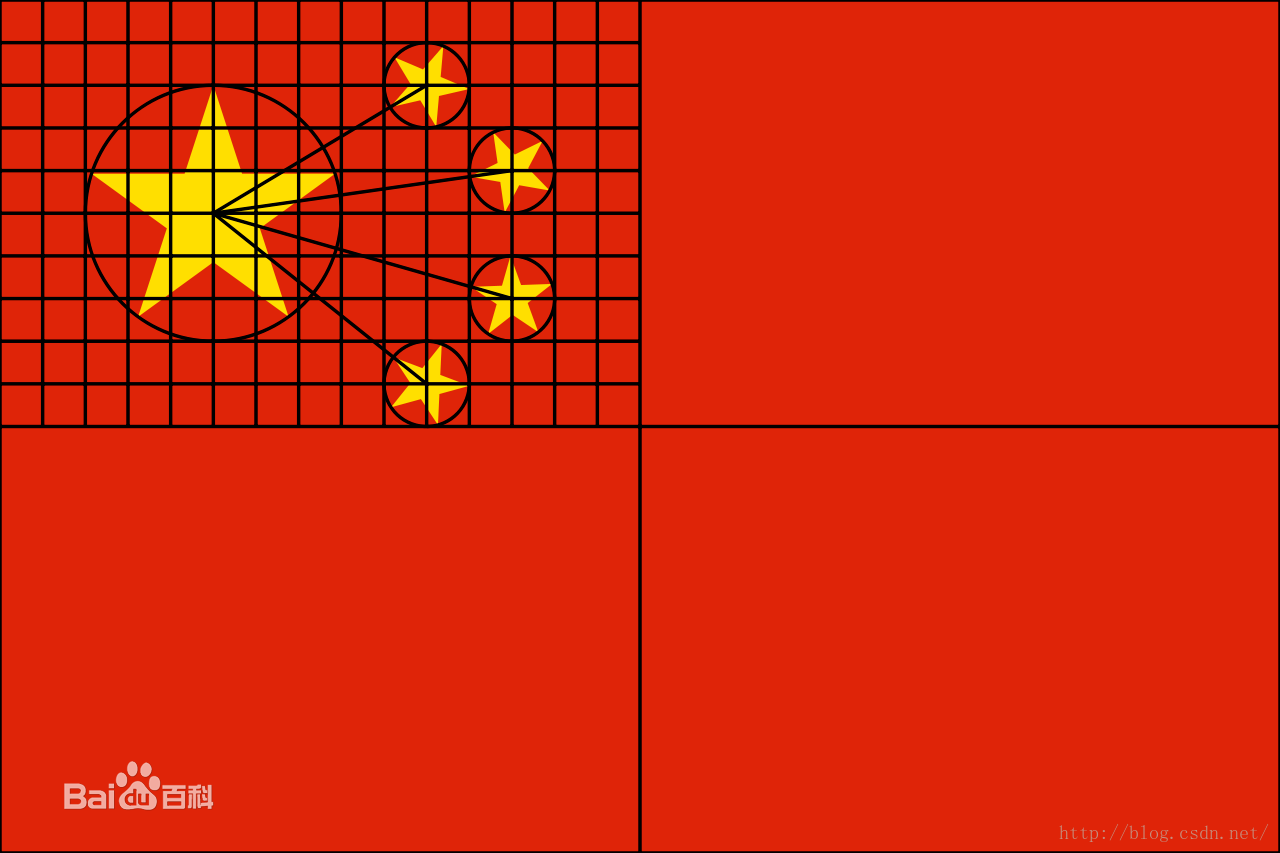 ·为便于确定五星之位置,先将旗面对分为四个相等的长方形,将左上方之长方形上下划为十等分,左右划为十五等分。如下图所示: