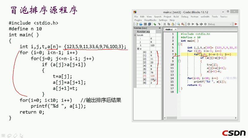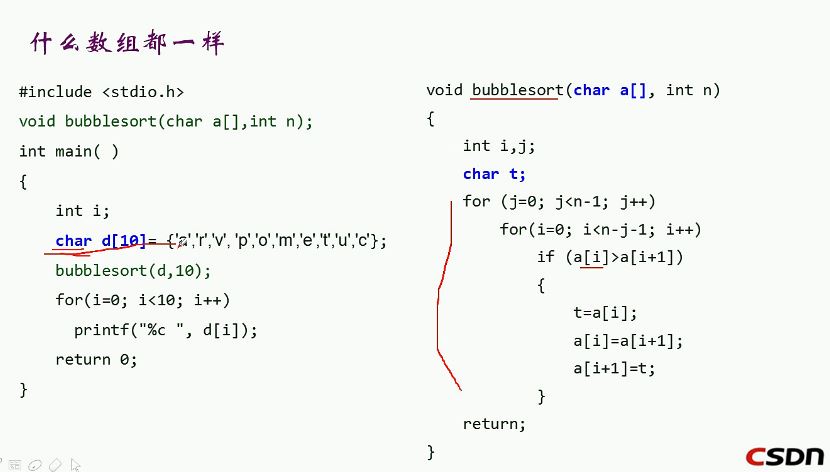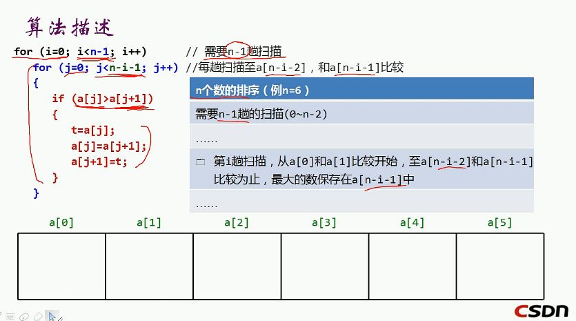 for(j=0;j<10-i-1;j++)//每一趟扫描到a[n-i-2]与a[n-i-1]比较为止结束