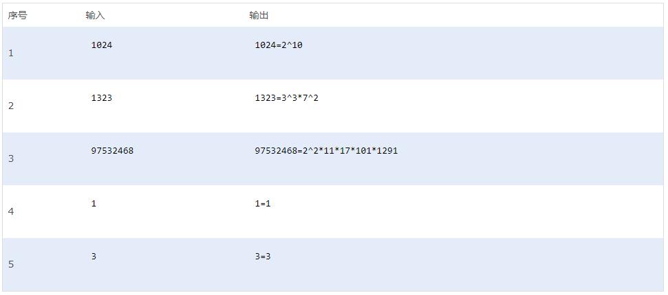 按给定格式输出N的素因式分解表达式,即 N = p1^k1 * p2^k2 *…*pm ^km,其中pi为素因子并要求由小到大输出,指数ki为pi的个数;当ki==1即因子pi只有一个时不输出ki。