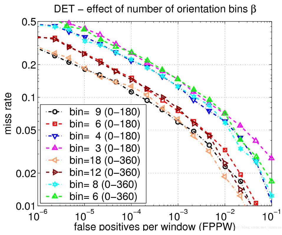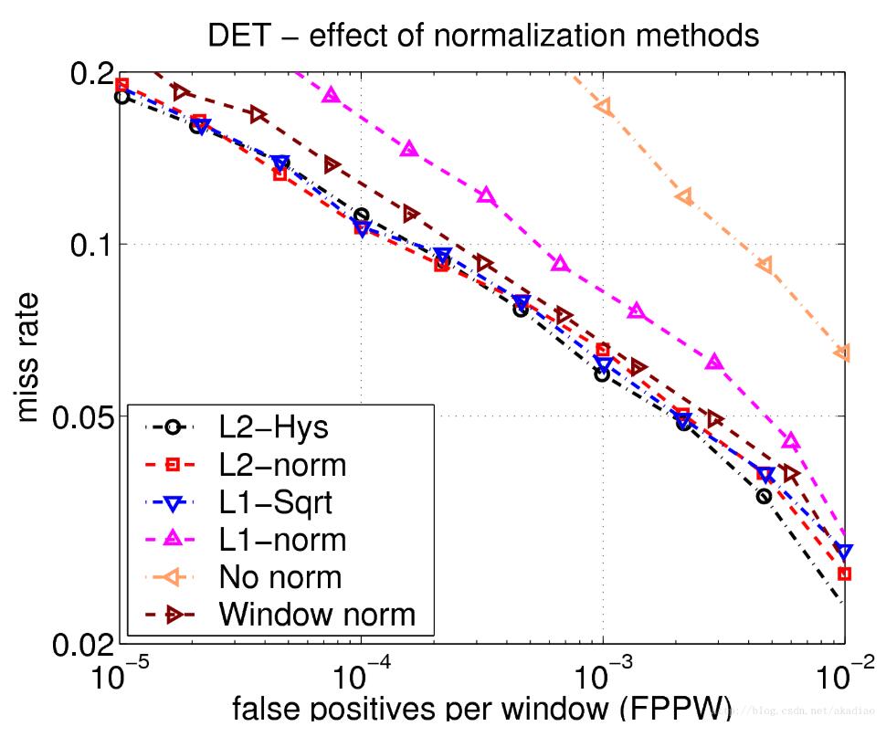 作者对比了L2-norm、L1-norm、L1-sqrt等归一化方法,发现都比非标准数据有显着的改善.其中L2-norm和L1-sqrt效果最好,而L1-norm检测效果要比L2-norm和L1-sqrt低5%.