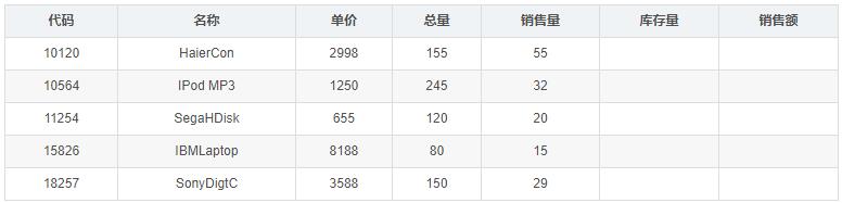 代码(整型),名称(字符串),总量(整型),单价(双精度),销售量(整型),库存量(=总量-销售量,整型),销售额(销售量*单价,双精度),例如目前有五种商品的基本信息,如表1所示。