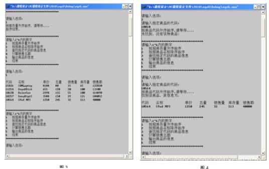 (3) 当用户输入正确菜单选项时,则调用对应函数,运行界面如图3所示(执行菜单项1与5后的界面)、图4(执行菜单项3后的界面)。