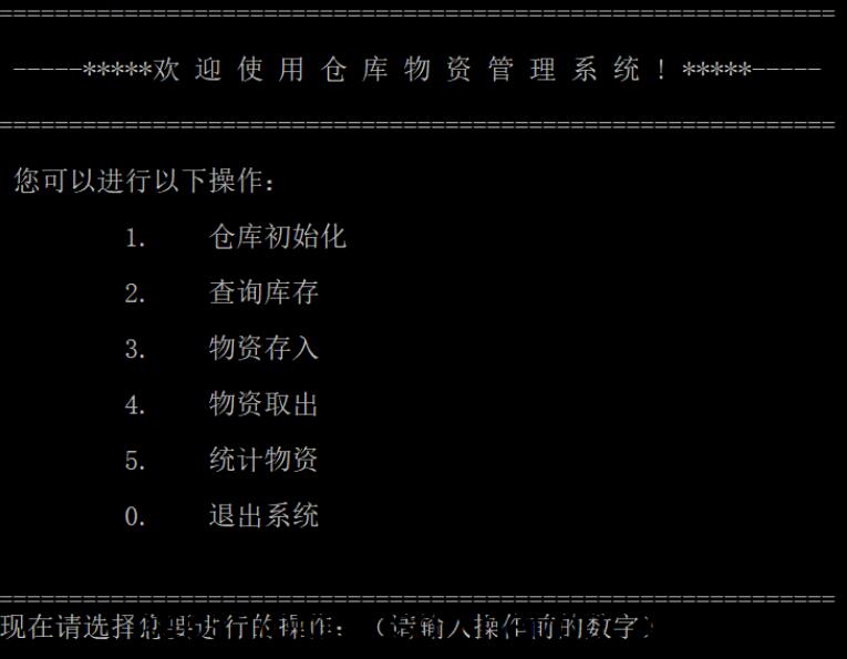 printf(" -----*****欢 迎 使 用 仓 库 物 资 管 理 系 统 ! *****----- \n");