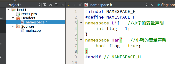 小李与小韩各自定义了以自己姓氏为名的命名空间,此时将小李与小韩的flag变量定义再置于同一个函数体中,则不会有任何问题,当然在使用这两个变量的时候需要指明所采用的是哪一个命名空间中的flag变量。