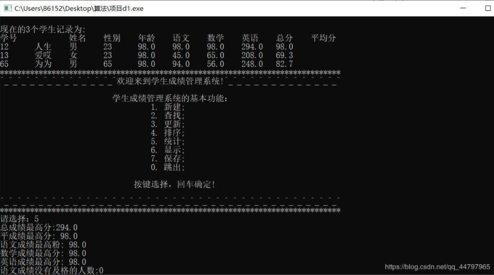 printf("1.按学号排序 2.按总分和平均分排序 3.按语文成绩排序 4.按数学成绩排序 5.按英语成绩排序 0.返回上一级\n");