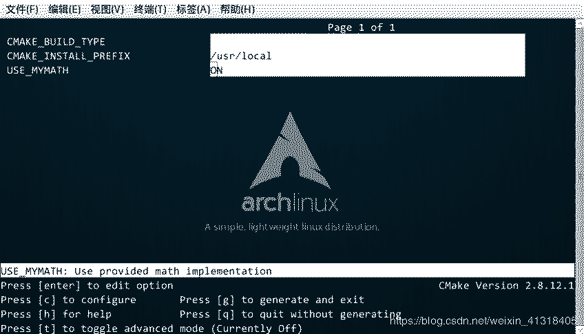 从中可以找到刚刚定义的 USE_MYMATH 选项,按键盘的方向键可以在不同的选项窗口间跳转,按下 enter 键可以修改该选项。修改完成后可以按下 c 选项完成配置,之后再按 g 键确认生成 Makefile 。ccmake 的其他操作可以参考窗口下方给出的指令提示。