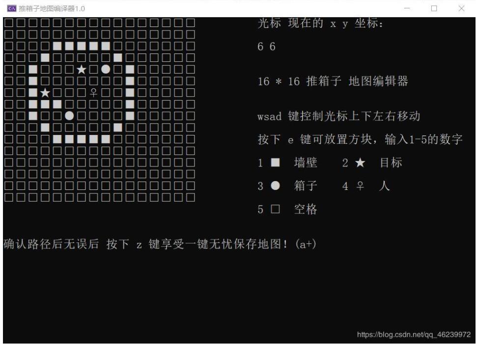通过移动光标在对应位置输出方块实现编辑地图功能,编辑完成后按下z键将地图保存进txt中。