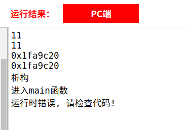 这是这个程序退出 f() 函数进入main函数的情况,因为b是局部变量,所以f()函数结束的时候,b会调用析构函数,释放age指向的堆内存。这时候a.set()就会发生错误,因为内存已经释放,无权修改内存里的值。就算没有set()函数,main函数结束的时候还会产生doublefree的错误,同一块内存被释放两次,C++文档说明这是个未定义行为,所以不同编译器可能处理手段不一样,我的gcc 7.4.0 竟然没有报错。后来我又在网上的一些在线编译器实验一下,有的会报错,有的不会。