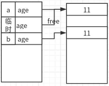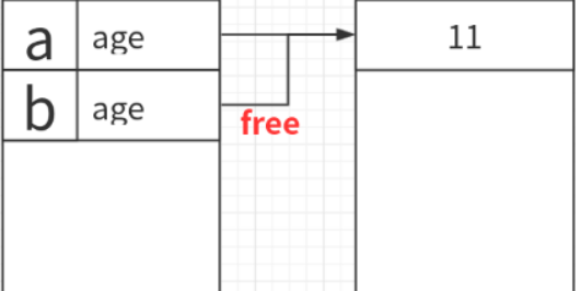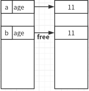 这是这个程序进入 f() 函数时的内存情况,两个age指针指向同一块内存。