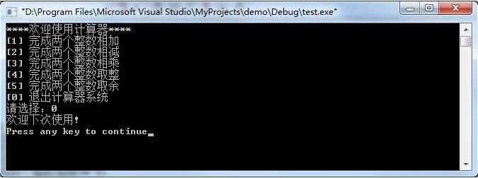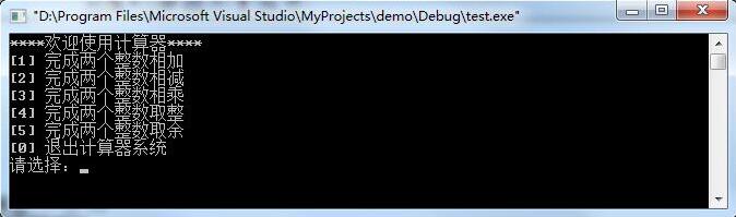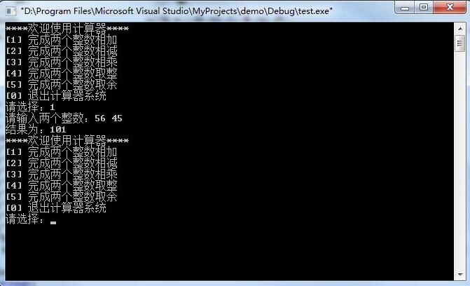 如:选择1,完成整数相加功能,算完后又能回到该页面。