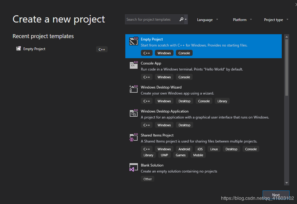 由于visual studio写代码,一定要新建工程,我们这边选择空的项目