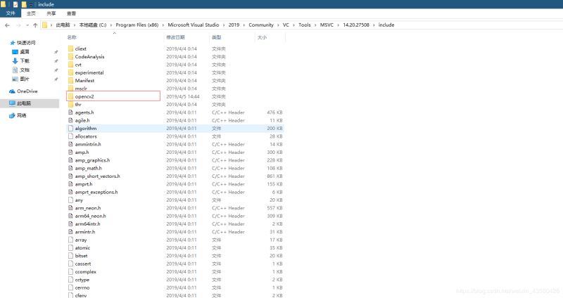 进入之后,可以看到如图所示标出的文件夹是不是似曾相识,没错,就是我们安装的opencv的build目录下的include目录里的内容。这里面的东西大家应该很清楚吧,就是opencv用到的头文件都在这里面。所以把它复制进来,我们建项目时候就不会报头文件找不到的bug了。