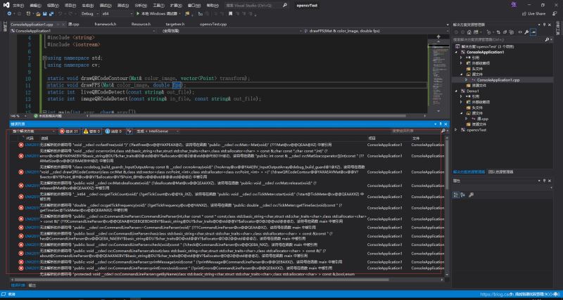 现在是又有头文件,又有库文件了吧,按理说我们应该是可以搞一波了,不信我们我贴个例子试一试。我贴了一个 opencv扫二维码的例子,结果报错,编译不过,这太伤人心了。