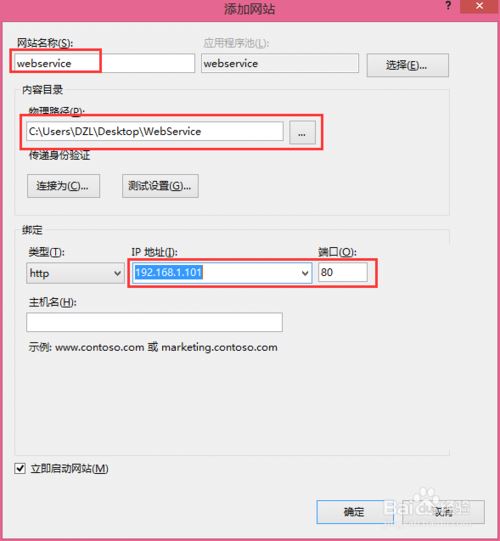 选择网站名称,刚刚发布的物理地址,还有发布的IP和端口;设置完后点击确定。