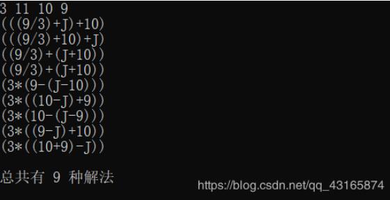4.递归过程中,判断是否(n==1&&A[0]==24),满足条件则输出结果。最后通过count最终知道有多少种解法