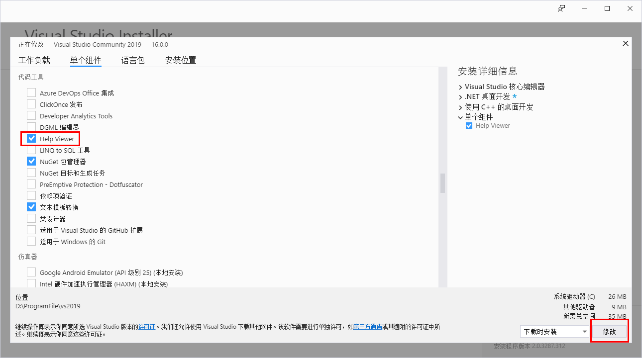 在 VS2019 中,通过点击菜单项 Tools->Get Tools And Features… 可以直接打开安装程序进行修改,如下图所示选中 Help Viewer,然后点击右下角的修改,等待安装完成。
