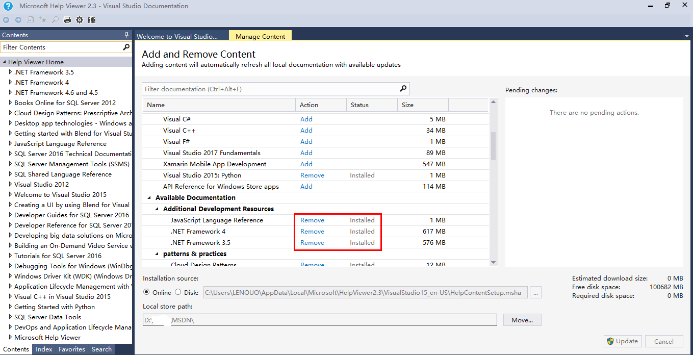 安装 Help Viewer 后,还需要在该软件中添加不同的技术文档进行更新才能看到文档内容。如果之前安装过 VS2015 及对应的 MSDN 文档(多达 6G 多),可以直接利用这些文档,无需重新下载。