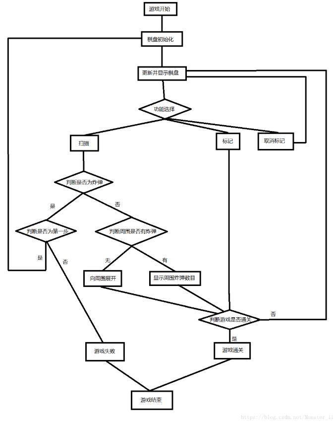 Tips:在扫描到周围无炸弹的格子时,要将此格子周围的部分依次打开,直到上下左右都出现炸弹数字为止,这里要用到递归的方法,我的顺序为依次递归处理上、左、下、右的格子,这里顺序可以任意。