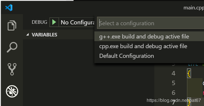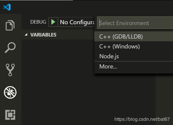如图示进入调试界面选择C++: 【该图已更新,老版本图已删除,反正debug就是按那个虫子的图标】
