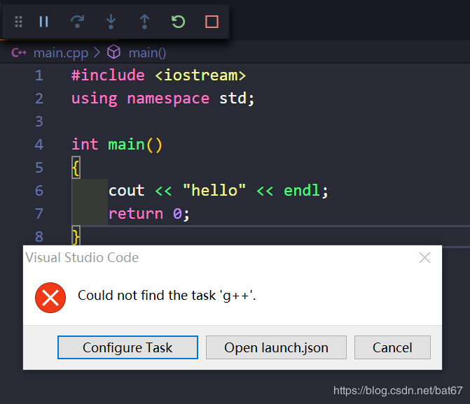 替换后保存,然后切换至test.cpp,按F5进行调试,此时会弹出一个信息框要求你配置任务运行程序,点击它~