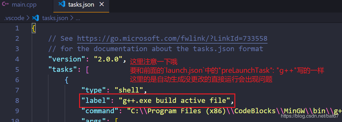注意:“label”那一行,要和前面的`launch.json`中的"preLaunchTask": "g++"这里写的一样,因为前面`launch.json`中的"preLaunchTask"里我改为了g++,所以这里我也改为g++,vscode默认的是`g++.exe build active file`【`launch.json`("preLaunchTask": "g++.exe build active file")和`tasks.json`("label": "g++.exe build active file"),都是默认的这个,当然无论是什么,只要保持一致就行】