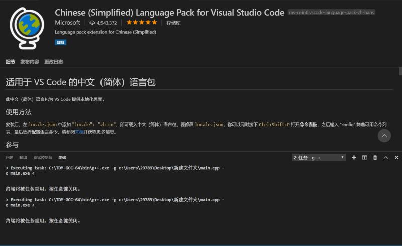 点击左侧栏第五个,在搜索框中输入"chinese",安装第一个插件(汉化),然后输入"c++",也安装第一个插件,然后重启,继续进行下一步操作。