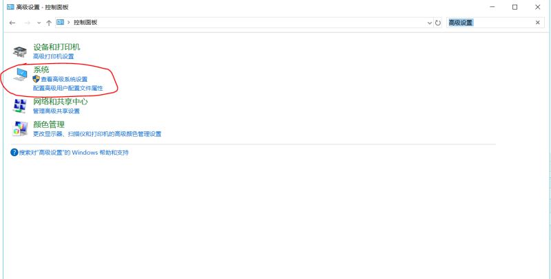 1.打开系统的控制面板,然后在红圈里搜索“高级设置”。