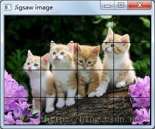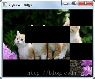 所有分割出来的子图像按随机顺序组成了“Splite image”图像后,通过鼠标单击事件响应函数,定位到鼠标单击点坐在的子图像,并把该子图像用模板匹配方法在原图像中定位出位置,最后合成到目标图像“Jigsaw image”