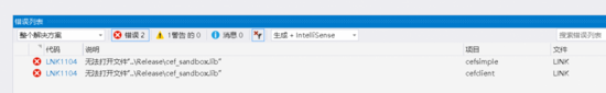 VS2015打开cef.sln然后直接编译即可生成libcef_dll_wrapper.lib文件了,如下图项目cefsimple项目和cefclient项目会失败,这个并不影响生成我需要的libcef_dll_wrapper.lib,我就不解决了。