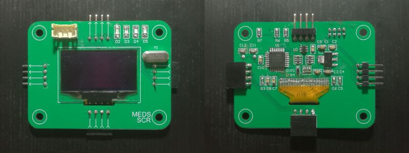 模块上有一个128*64的单色显示屏,一个单片机(B)控制它显示的内容。单片机的I²C总线通过四边上的排针排母连接到其他单片机(A)上,A给B发送指令,B绘图。