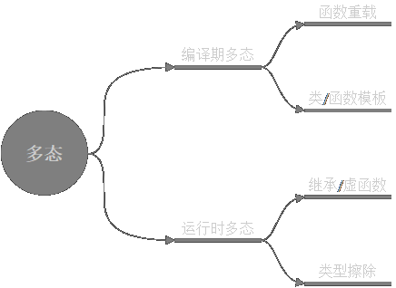 先说编译期多态。非模板函数重载是一种多态,用相同的名字调用的函数可能是不同的,取决于参数类型。如果你需要一个函数名字能够多处理一种类型,你就得多写一个重载,这样的多态是封闭式多态。好在新的重载不用和原有的函数写在一起。