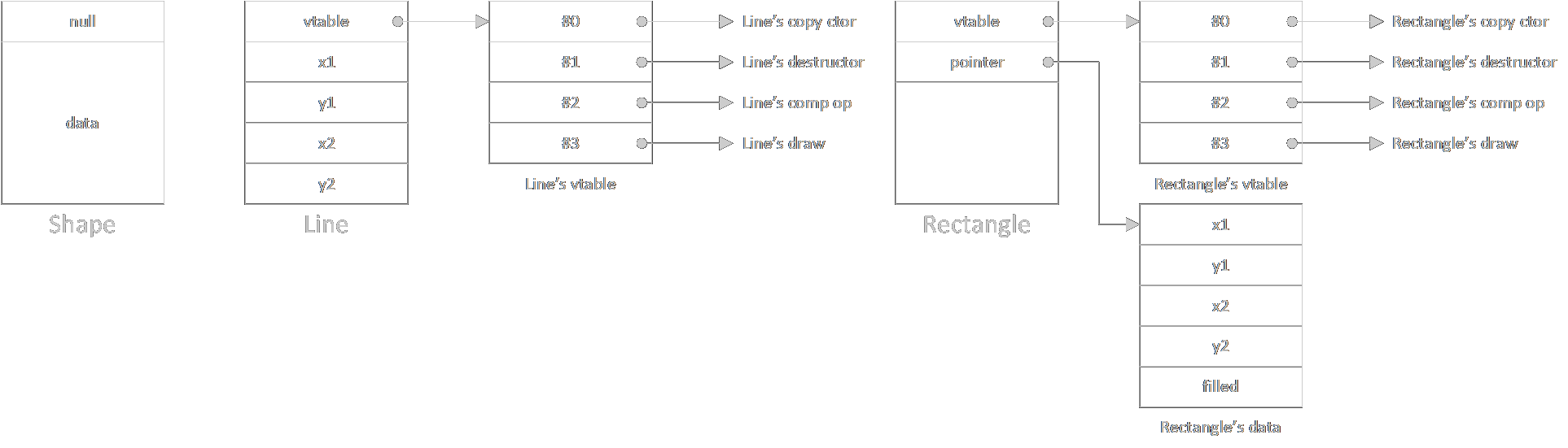 这种实现可以推及到继承树(强调“树”,即单继承)的情况。至于多重继承中的指针偏移和虚继承中的子对象指针,过于复杂,我就不介绍了。