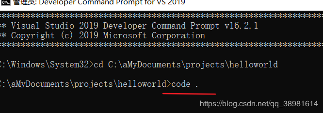 3、我们要在开发人员命令提示符下,进入这个名为 “helloworld”的子文件夹,然后用VSC打开这个文件夹,具体操作如下: