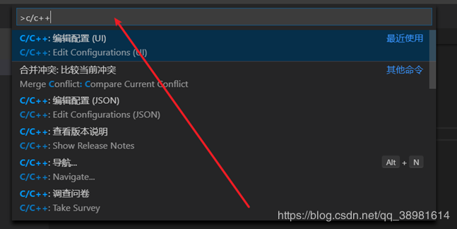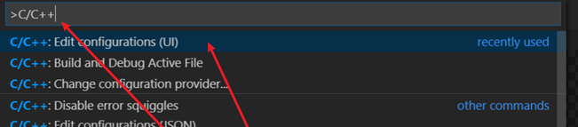 按Ctrl + Shift + P打开命令调面板,并输入C/C++,并点击编辑配置”(UI)